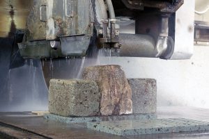 にお願いし、田野工場で慎重に泥を落とし、不要な傷を付けないよう気を使いながら、ダイヤモンド・カッターで切断。この名誉ある「研究のための処置」をお願いした職人さんは、以前に「明日館」の修復工事に携われた方で、水洗いと乾燥後、採掘して間もない石に劣らないフレッシュな断面を呈することに驚かれています。