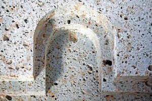 3. 大きな「ミソ」が多数含まれる「荒目」の大谷石の一種で、「ミソ」の生み出す縞文様が「虎の皮」を思わせます。産出量が少ないため、珍しい石材として珍重されて来ました。